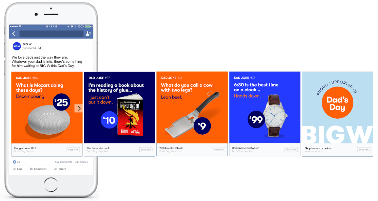 For Father’s Day 2018, BIG W wanted to embrace the dorky side of dads, often ignored in campaigns for this occasion. And the most endearing symbol of ‘dadness’ in our culture is the dad joke. So we decided to use the light-hearted nature of dad jokes as the hook for our ads, linking each joke to a product on offer.